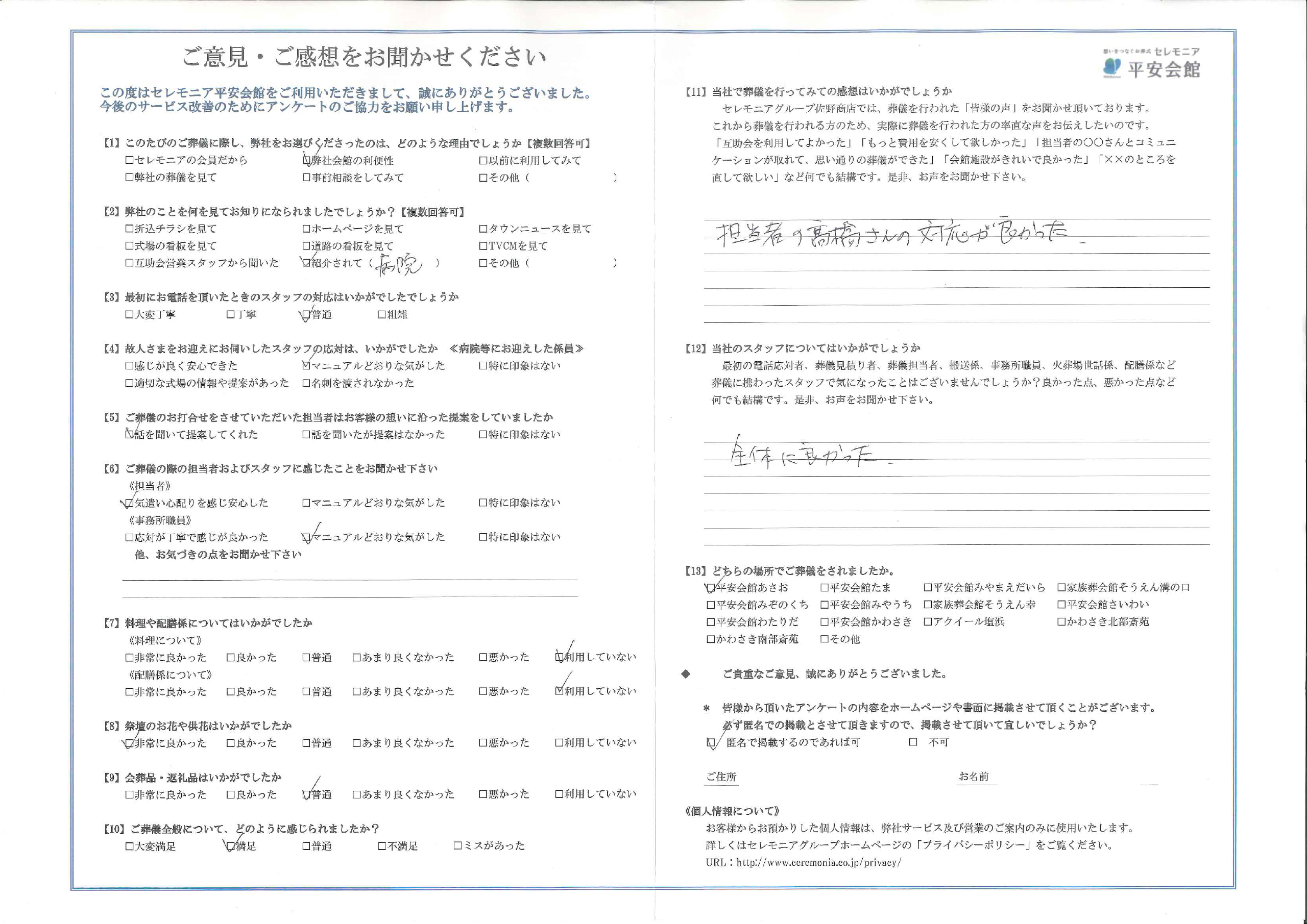 全般的にスタッフの対応は良かった。特に葬儀担当の高橋さんは、親切かつ適切な判断とアドバイス、タイムリ―な連絡等、感心することばかりだった。