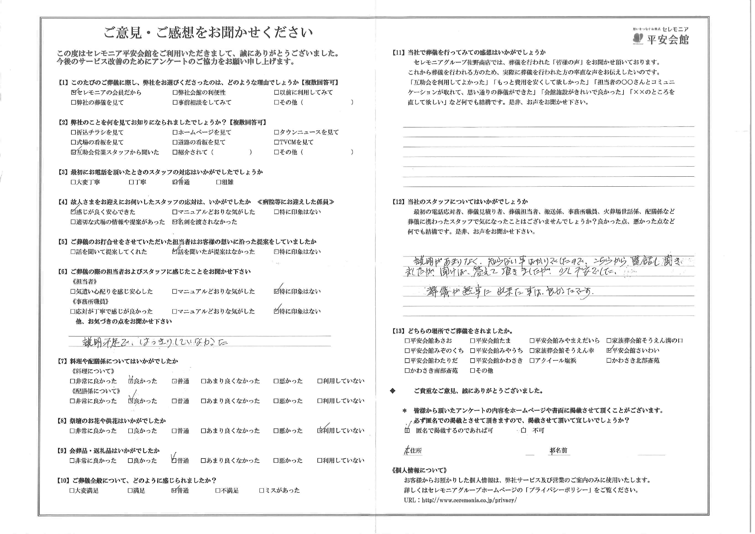 平安会館さいわいをご利用いただいたお客様から、実際に葬儀を行った感想や弊社スタッフやサービスについてご意見をいただきました。
