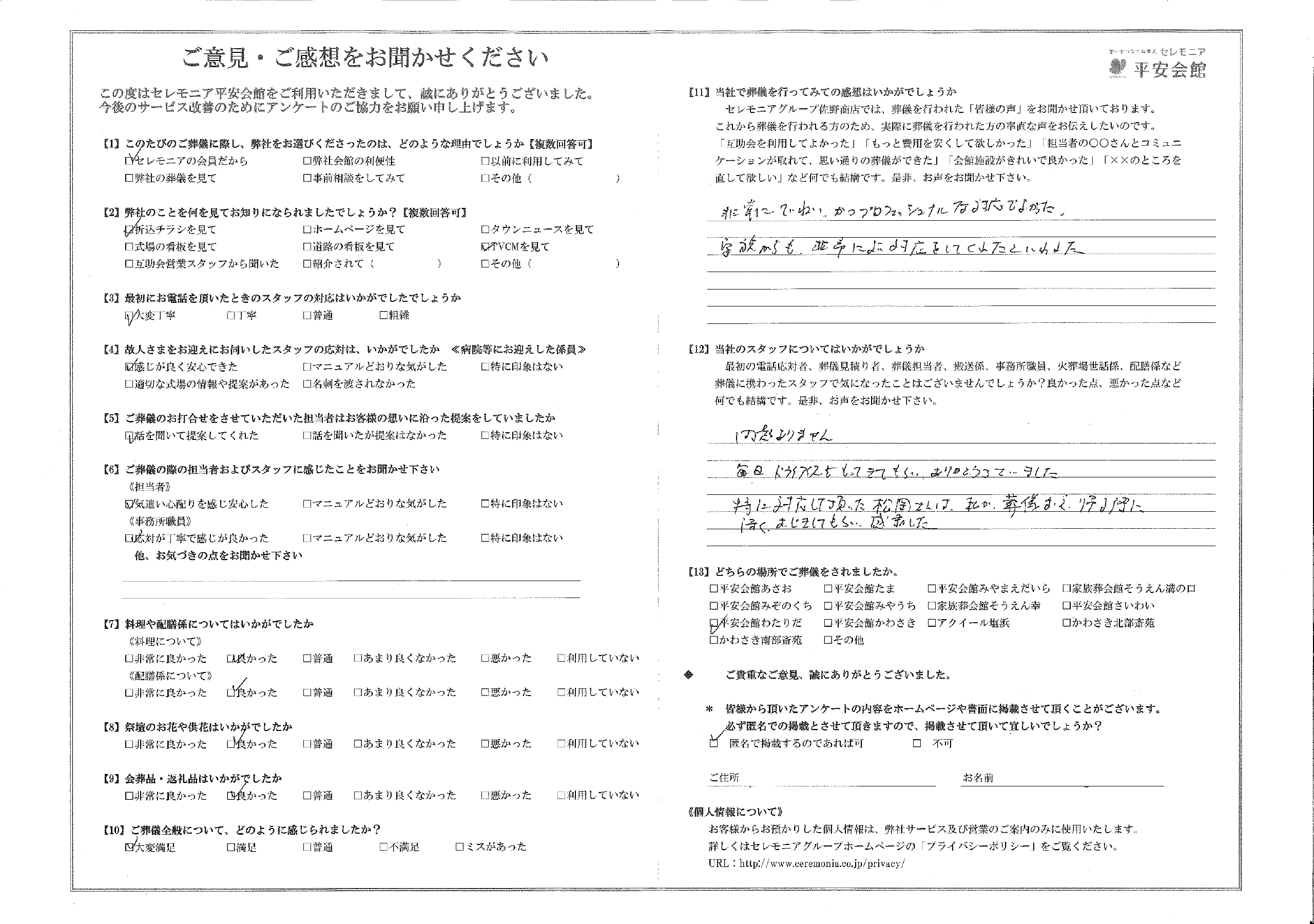 平安会館わたりだを実際にご利用いただいたお客様から、葬儀を行った感想や弊社スタッフやサービスについてのご意見をいただきました。